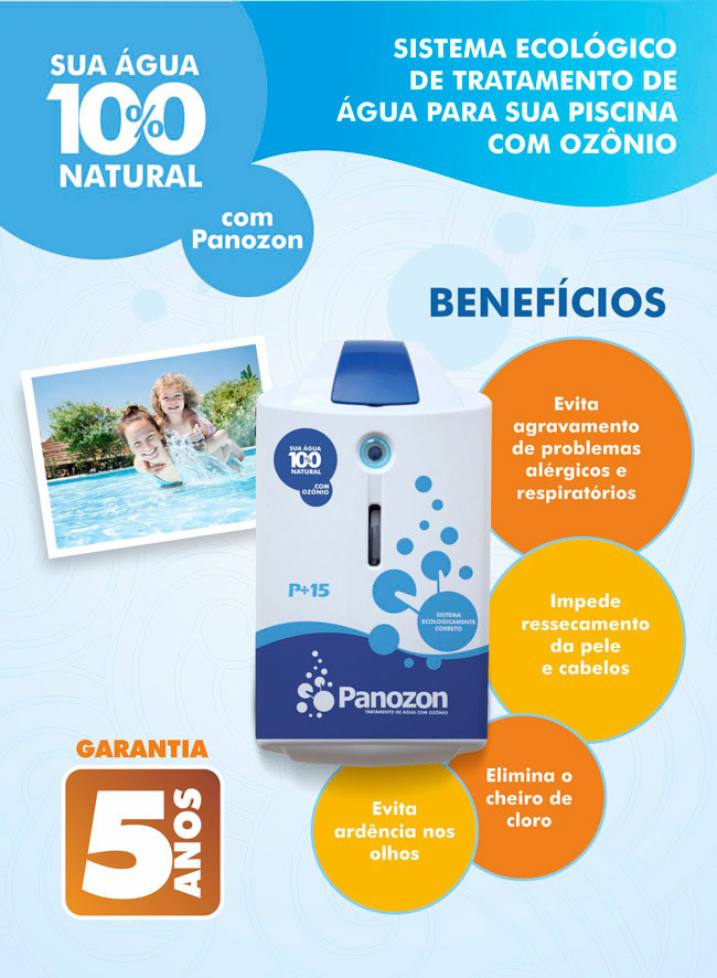 Porém, o ozônio deve ser sempre utilizado em conjunto com o cloro pois, além de ser uma exigência legal no país, possui ação residual. Assim, nadando em uma piscina com cloro e ozônio Panozon, você terá o benefício da proteção do cloro sem nenhum desconforto.